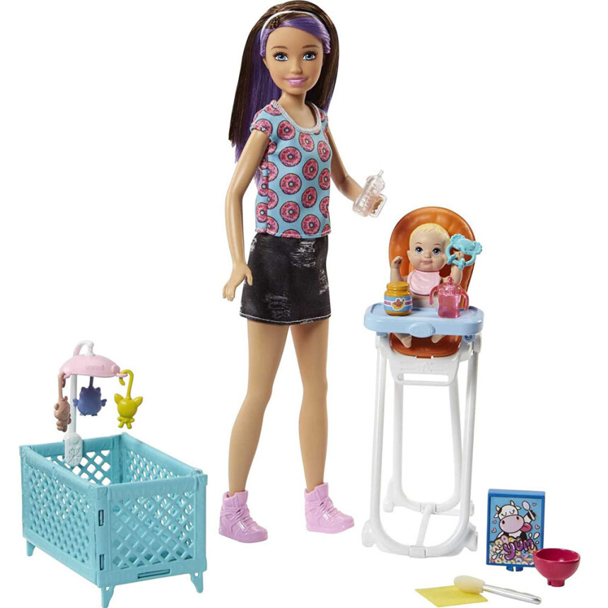 Play out classic babysitting moments with this Barbie Skipper Babysitters Inc. playset -it comes with a babysitter doll, a baby doll and accessories themed to feeding and naptime, including a high chair and a crib.