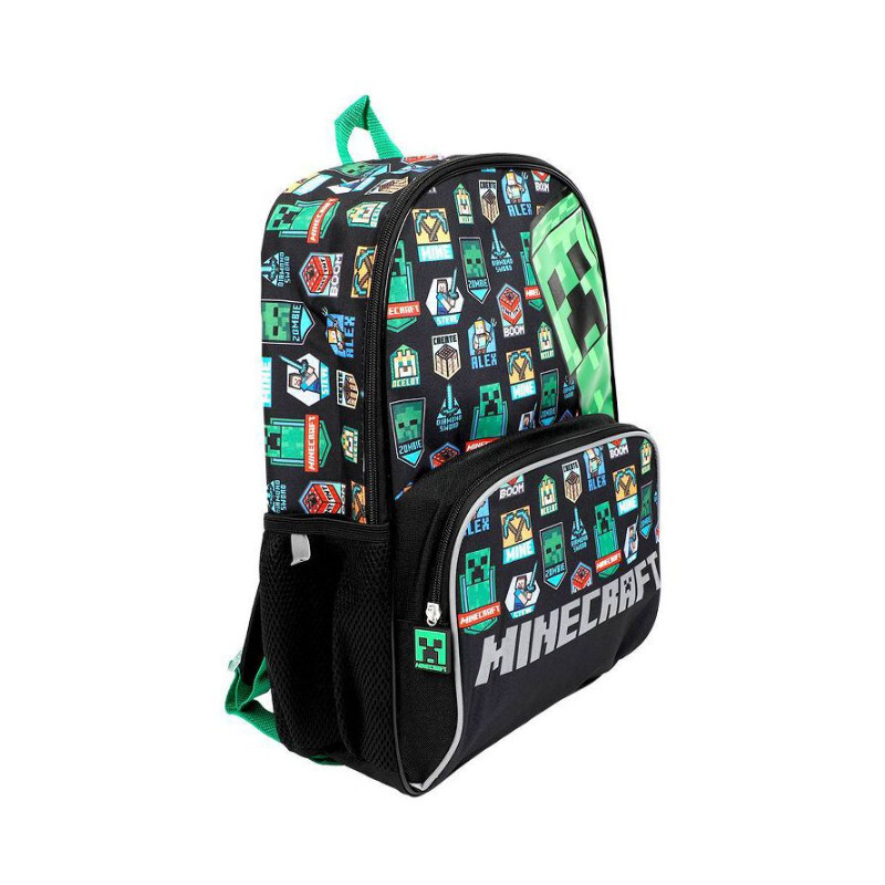 This Minecraft 16” Backpack offers plenty of space to carry school supplies while the side mesh pockets allow easy access to water bottles. Images of achievements from the Minecraft games decorate the bag while a creeper face on the zipper pull completes the design. The padded back and the adjustable shoulder straps add to this Minecraft 16" backpack’s comfort.